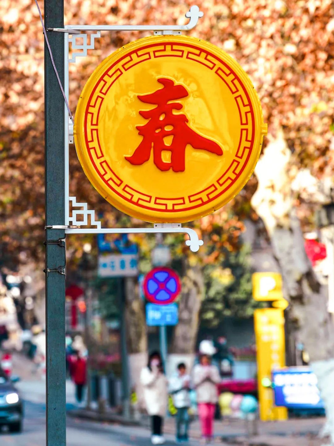 武昌昙华林的“春”字灯饰下游客三三两两边逛边拍照