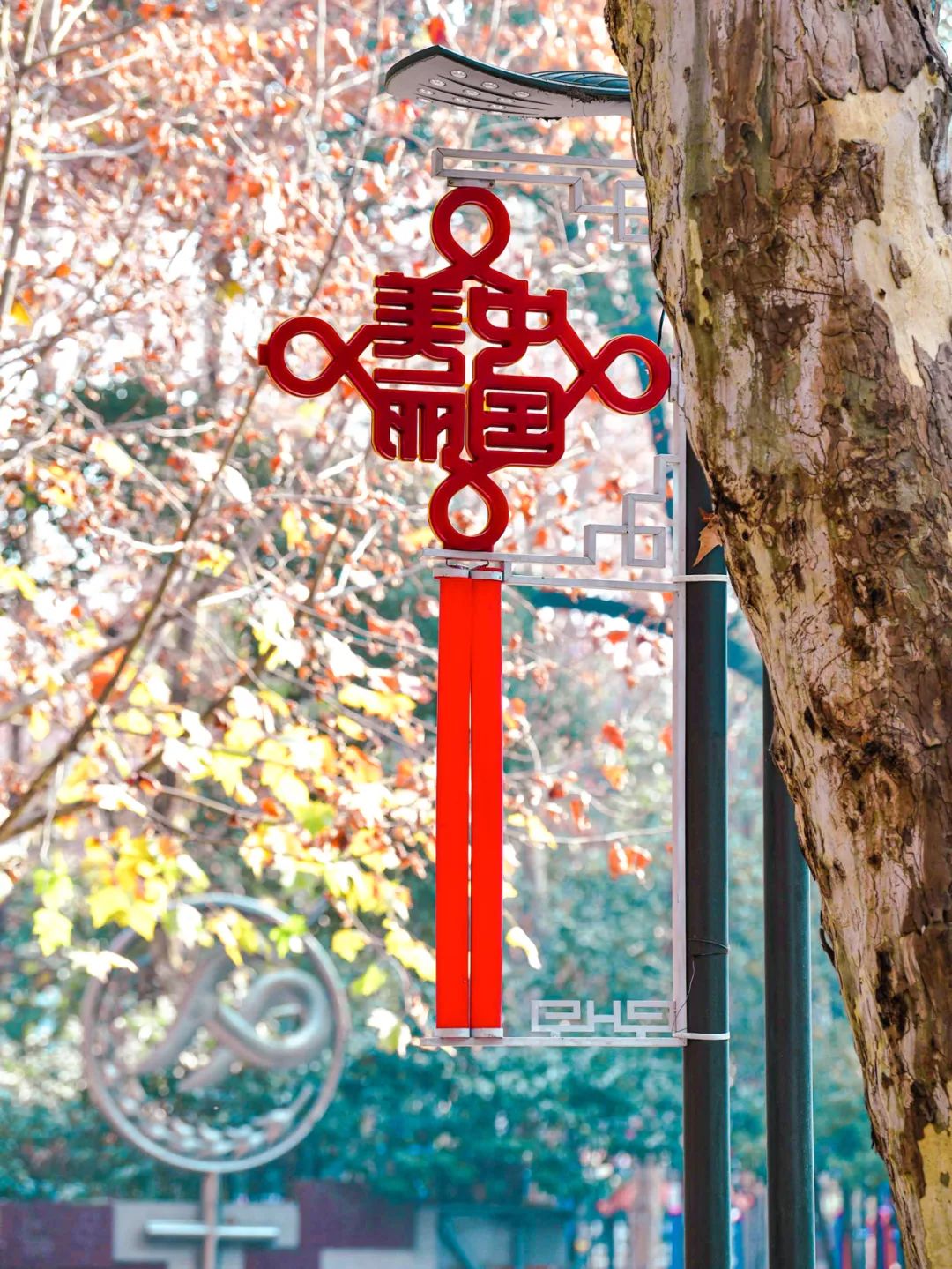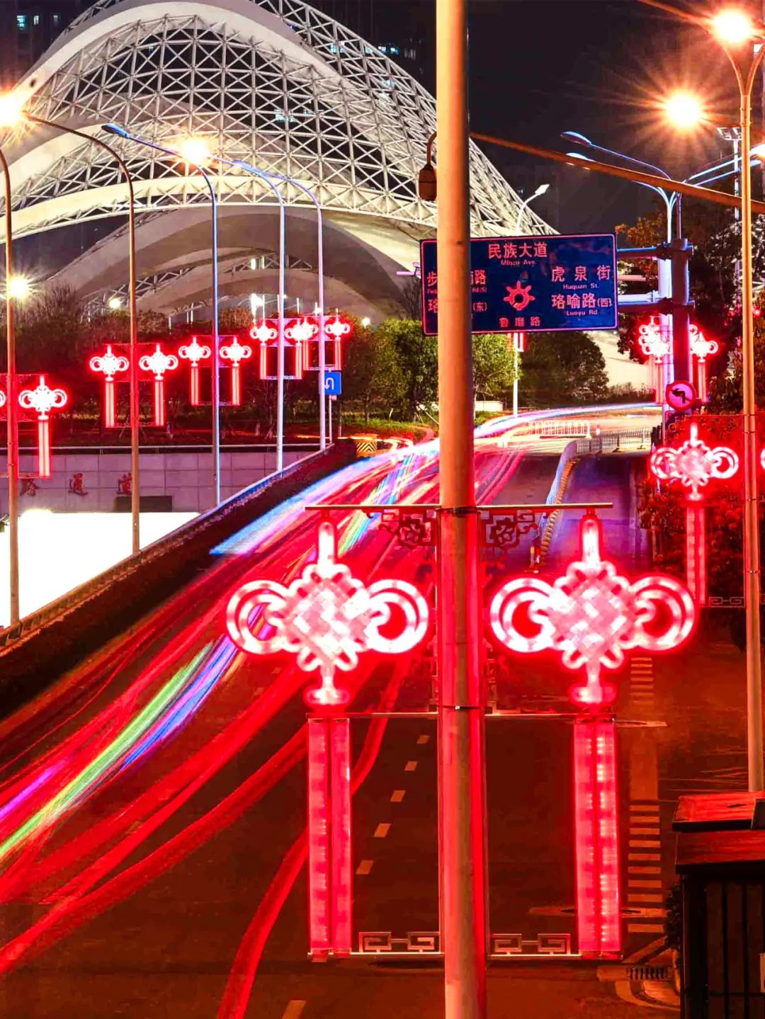 “春”字灯饰悬挂于昙华林、户部巷、首义广场周边“美丽中国”字样中国结则悬挂于水果湖步行街等处