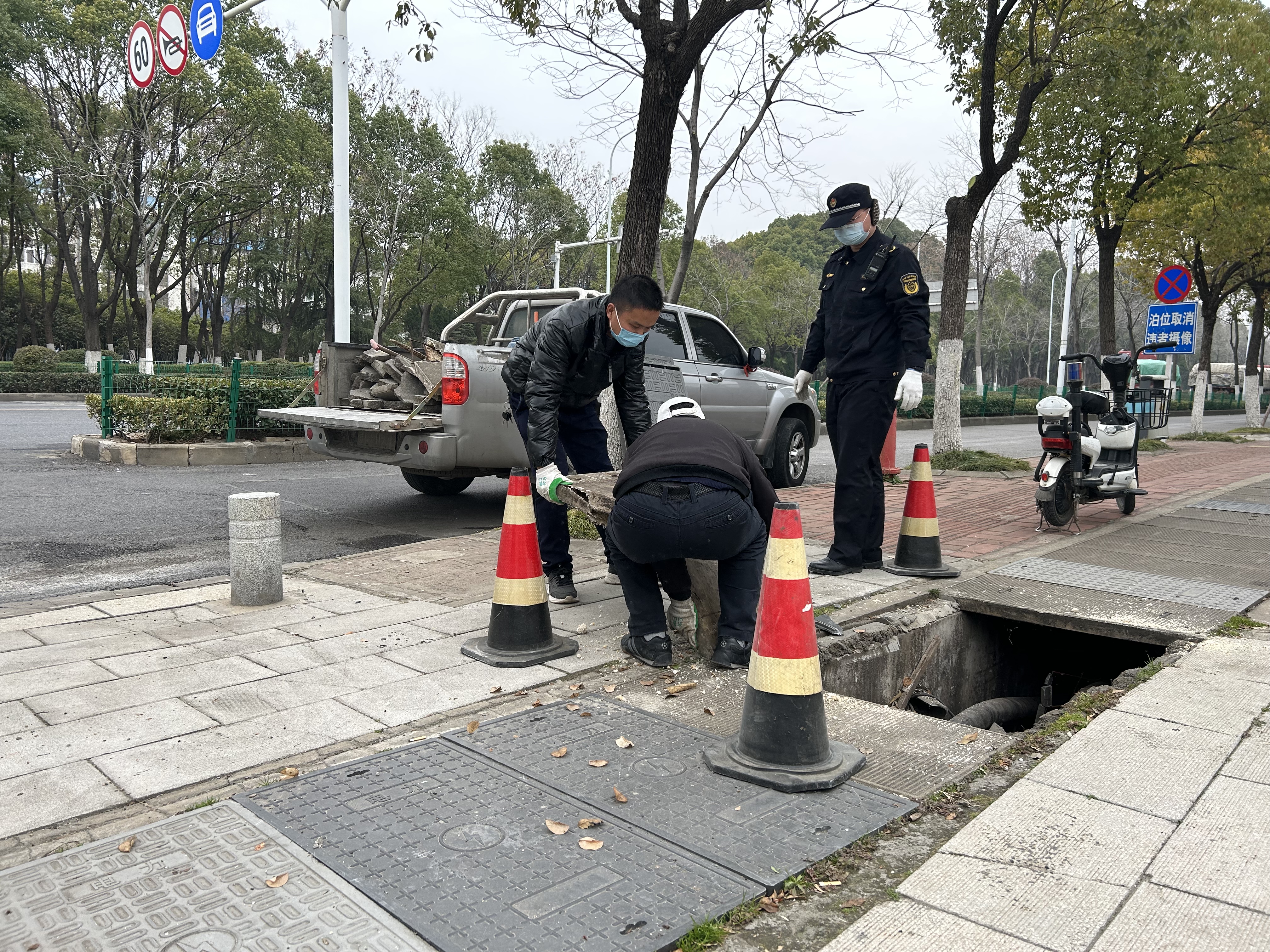 “好的好的。”井盖权属单位立马回复。城管路长听到答复后,将巡逻电动车推至一旁,并用交通路障在破损井盖四周打围,以防路人不小心踩入。
