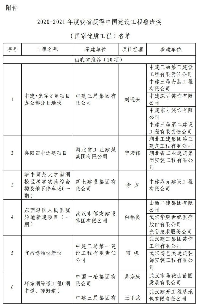 2月7日获悉,湖北省中建·光谷之星项目办公部分H地块等14项工程荣获2020-2021年度中国建设工程鲁班奖(国家优质工程)。