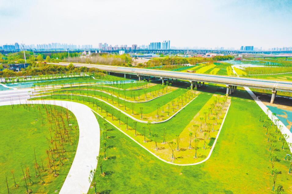 4月1日,武汉府澴河出口河段综合整治工程(一期)滨江公园绿草如茵、油菜花盛开。 (湖北日报全媒记者 薛婷 通讯员 戴志伟 摄)