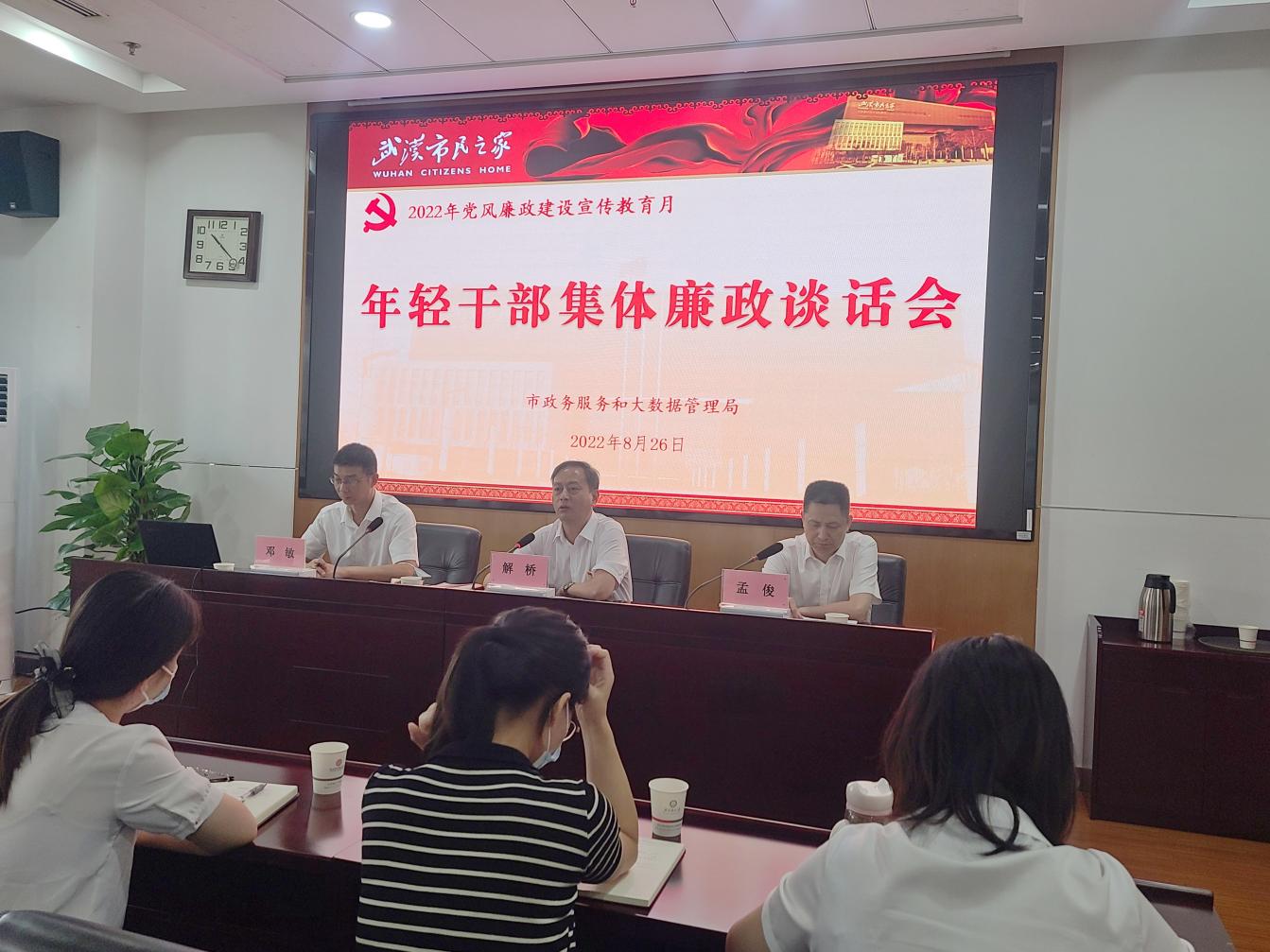 根据2022年党风廉政宣教月活动安排,2022年8月26日,市政务服务和大数据管理局组织召开年轻干部集体廉政谈话会。会议由机关纪委专职副书记邓敏同志主持。局机关、事业单位新提拔、新入职年轻干部及新发展转正党员、入党积极分子参加。