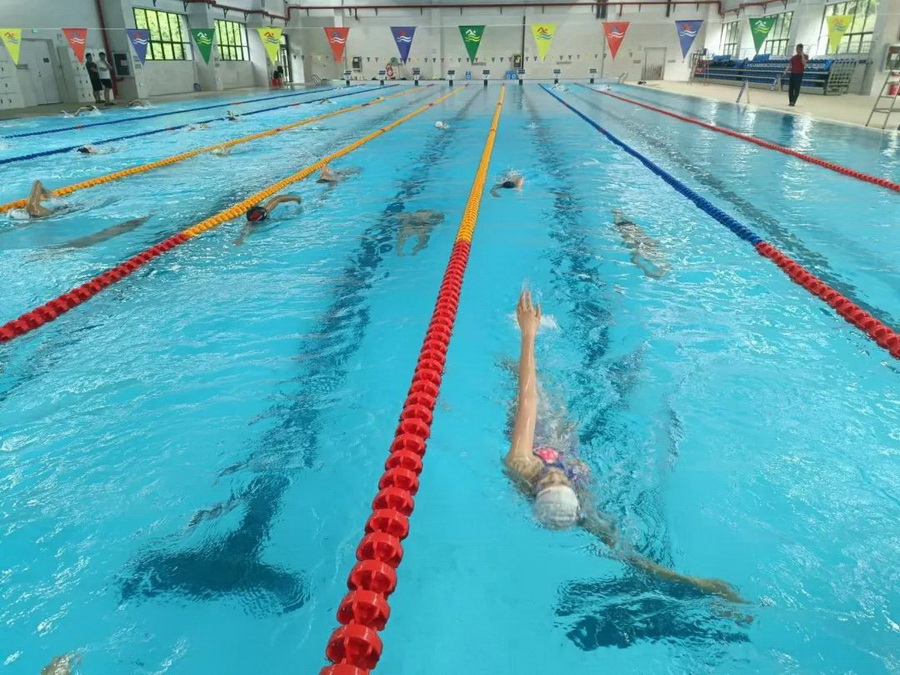 5月17日8时,游泳队的运动员准时出现在游泳馆内。在进行了近半个小时的岸上热身后,只听教练员一声哨响,泳池内顿时水花翻滚。队员们分成几个小组,展开了多种泳姿的训练。一时间,击水声,哨子声,教练员的口令声在巨大的场馆上空回荡,场面煞是热闹。