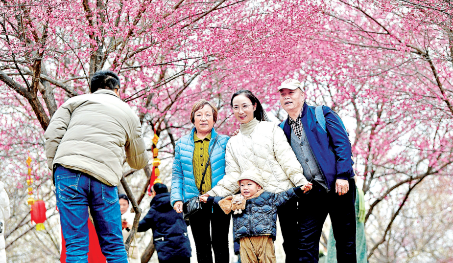 在竹叶海公园梅花坡,盛开的梅花吸引了不少市民前来打卡拍照。