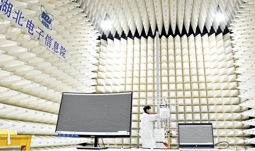 长江日报记者在该平台“3米法半/全电波暗室”内看到,各类天线装置环立,环顾四周,墙面都铺设了白色锥形吸波材料,吸收着电磁波能量,确保辐射骚扰试验的顺利进行。