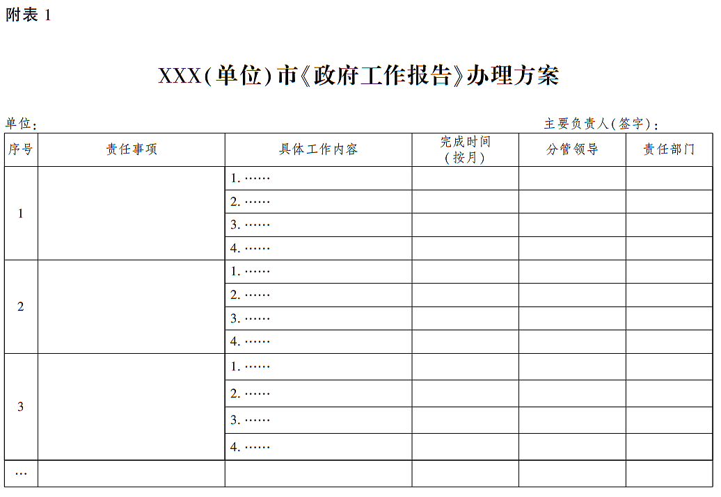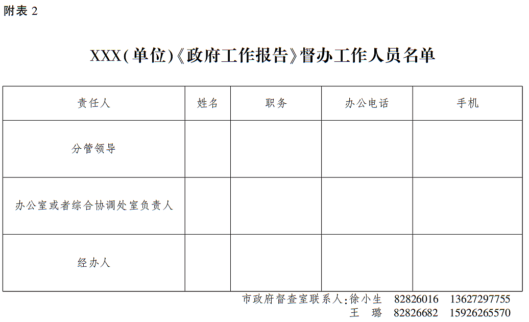 一、高度重视,精心组织,科学制订办理方案。各责任单位要逐项系统科学谋划研究所承办的责任事项,特别是牵头单位(无牵头单位的,责任单位即为牵头单位,下同)要统筹相关责任单位制订办理方案,明确工作目标、具体措施、完成时限、分管领导以及责任部门,实行清单管理,形成工作闭环。各牵头单位于2023年2月10日前将制订的办理方案、督办工作人员名单及其联系方式报市人民政府督查室(报送式样见附表1、2)。