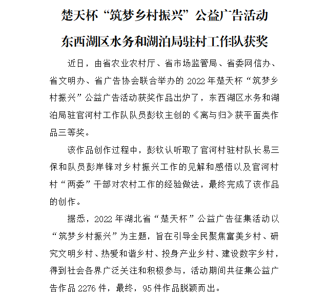 东西湖区水务和湖泊局驻村工作队获奖